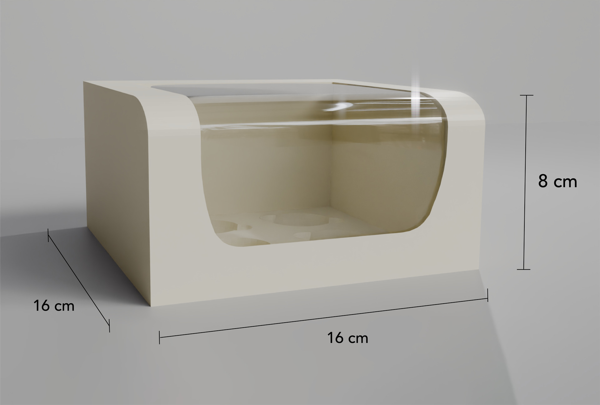 Medidas 16 x 16 x 8cm en cartulina sulfatada importada grado alimenticio, aprobada por FDA, calibre 18 ptos., color blanco.